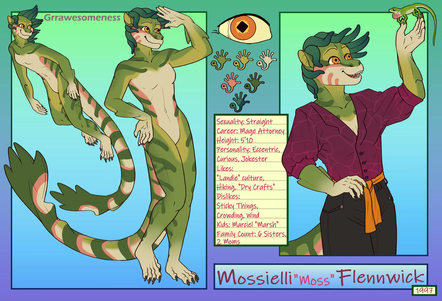 Front and back pose of character, (optional) clothed pose of character, Eye Reference, Unique Colour Palette (shaped by character's personality), (optional) Box of information
