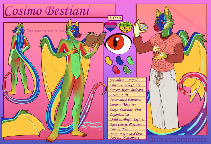 Front and back pose of character, (optional) clothed pose of character, Eye Reference, Unique Colour Palette (shaped by character's personality), (optional) Box of information